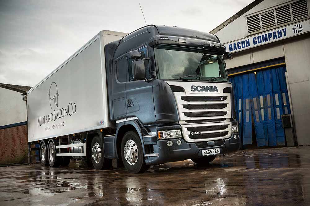 The first truck to bear the Midland Bacon Co name is fitted with an aerodynamic Gray & Adams temperature-controlled body mounted on a 32-tonne Scania chassis.